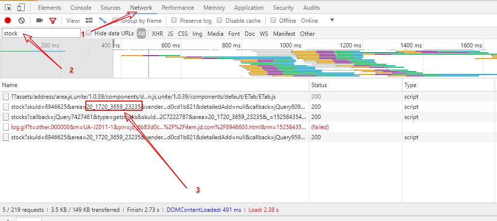 用 Chrome 浏览器的话,就可以直接 F12 页面检查,先切到 Network,然后在过滤器上输入 stock,最后得出的 area 后面的那串数字就是了,如图: