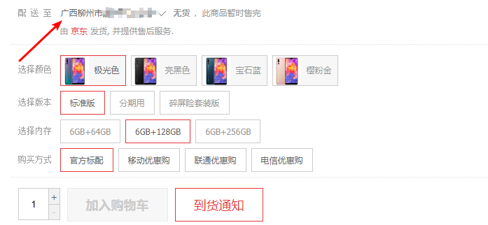 那么上京东上看一下啊,也是显示没货,每晚 8 点也有个抢购时间,我试了下,是有货的,但基本是黑色和蓝色,两种渐变颜色极光色和樱粉金基本瞬间光,我有一天晚上能加上购物车,一点提交订单就显示没了。